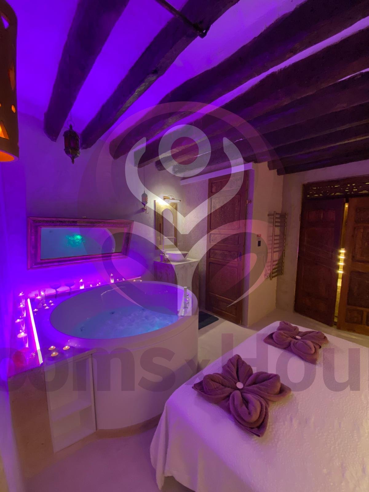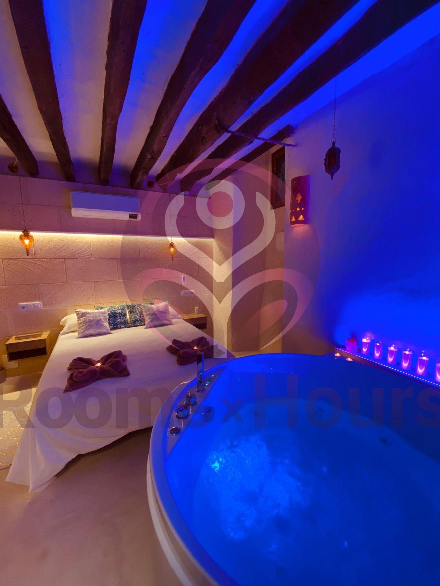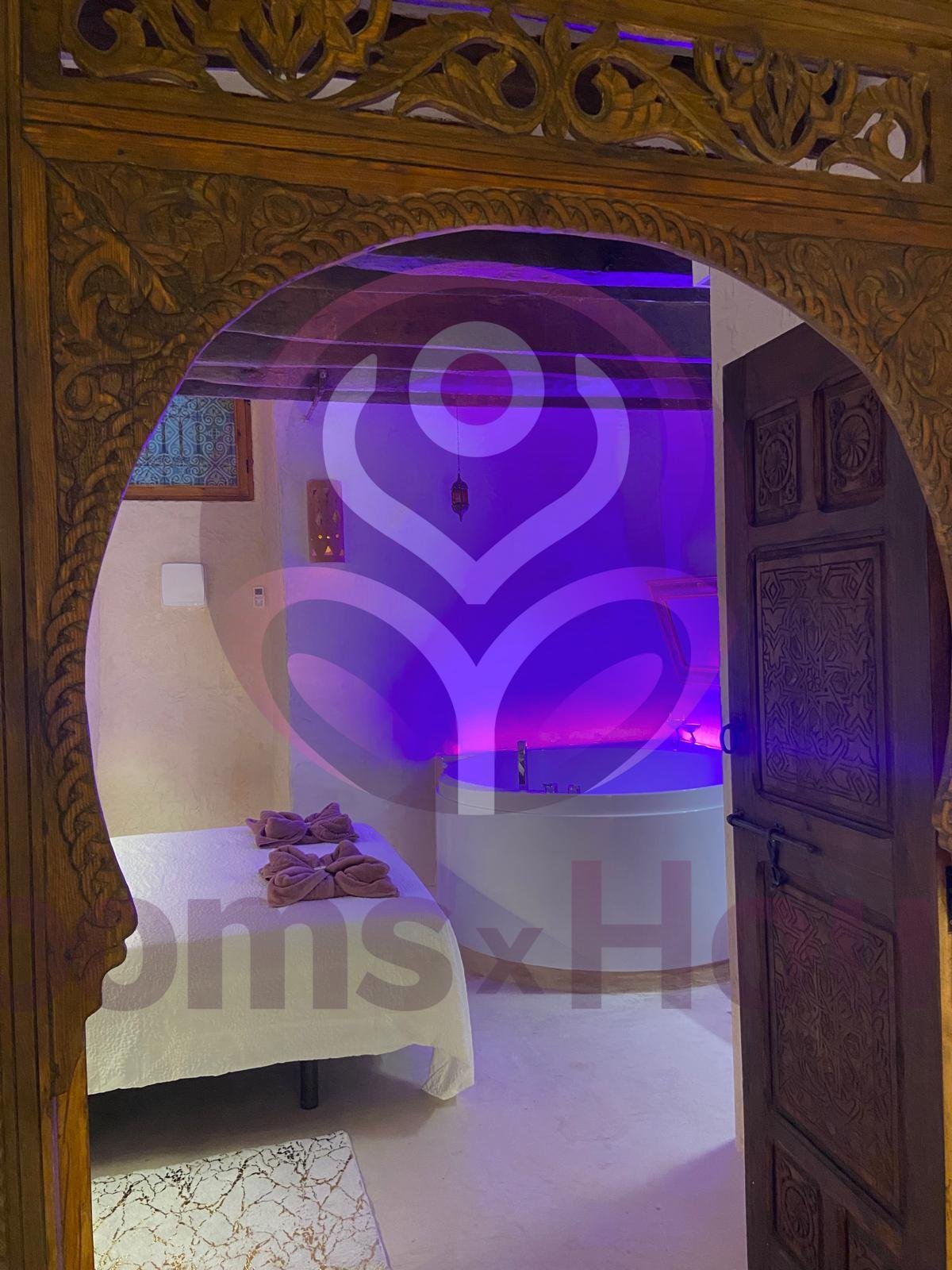 Su cuidada estética de inspiración marroquí 🕌 envuelve con una atmósfera cálida, sugerente y acogedora. La iluminación tenue, los detalles artesanales y las texturas crean el escenario perfecto para desconectar del exterior y centrarse únicamente en disfrutar en pareja ❤️.
